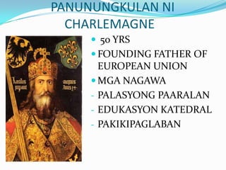 Nagkakaisa siya ng kanluran at gitnang Europa noong unang bahagi ng Middle Ages. Kaya ang Banal na Imperyo ng Roma na ang pinakasentro ay ang papadong Roma ang kumontrol sa mga pangyayari sa daigdig sa loob ng mahabang yugto ng kasaysayan na tinawag na Madilim na Panahon. Ang malaking barkong pangkalakalan na nagdadala ng mga produkto mulasa Pilipinas patungo sa bansang Mexico2.