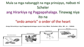 Ayon sa hirarkiya ng pagpapahalaga ni Max Scheler ano ang pagkakasunod-sunod ng mga pagpapahalaga mula sa pinakamababa hanggang sa pinakamataas na pagpapahalaga. Pag-unawa sa kahulugan ng buhay na ibinigay ng Diyos 3. Ang durasyon ng tagal ng pakiramdam na to ay sandali lamang.