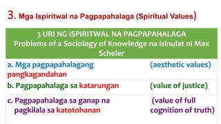 Ispiritwal na halaga ayon kay max scheler. Pagpapahalaga sa ganap na pagkilala sa katotohanan d. Pagpapahalaga sa katarungan value of justice c. Pagpapahalaga sa katiwasayan ng damdamin at isipan.