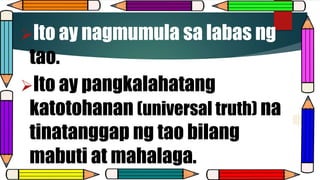 Ito ay pangkalahatang katotohanan universal truth na tinatanggap ng tao bilang mabuti at mahalaga. Pandamdam na mga Pagpapahalaga Sensory Values.